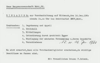 Nach Abschluss der Bauarbeiten im Laufenbach macht sich der engagierte Vorstand auf die Suche nach weiterem Bauland und findet dieses an der Weierstrasse, ebenfalls in Rüti.